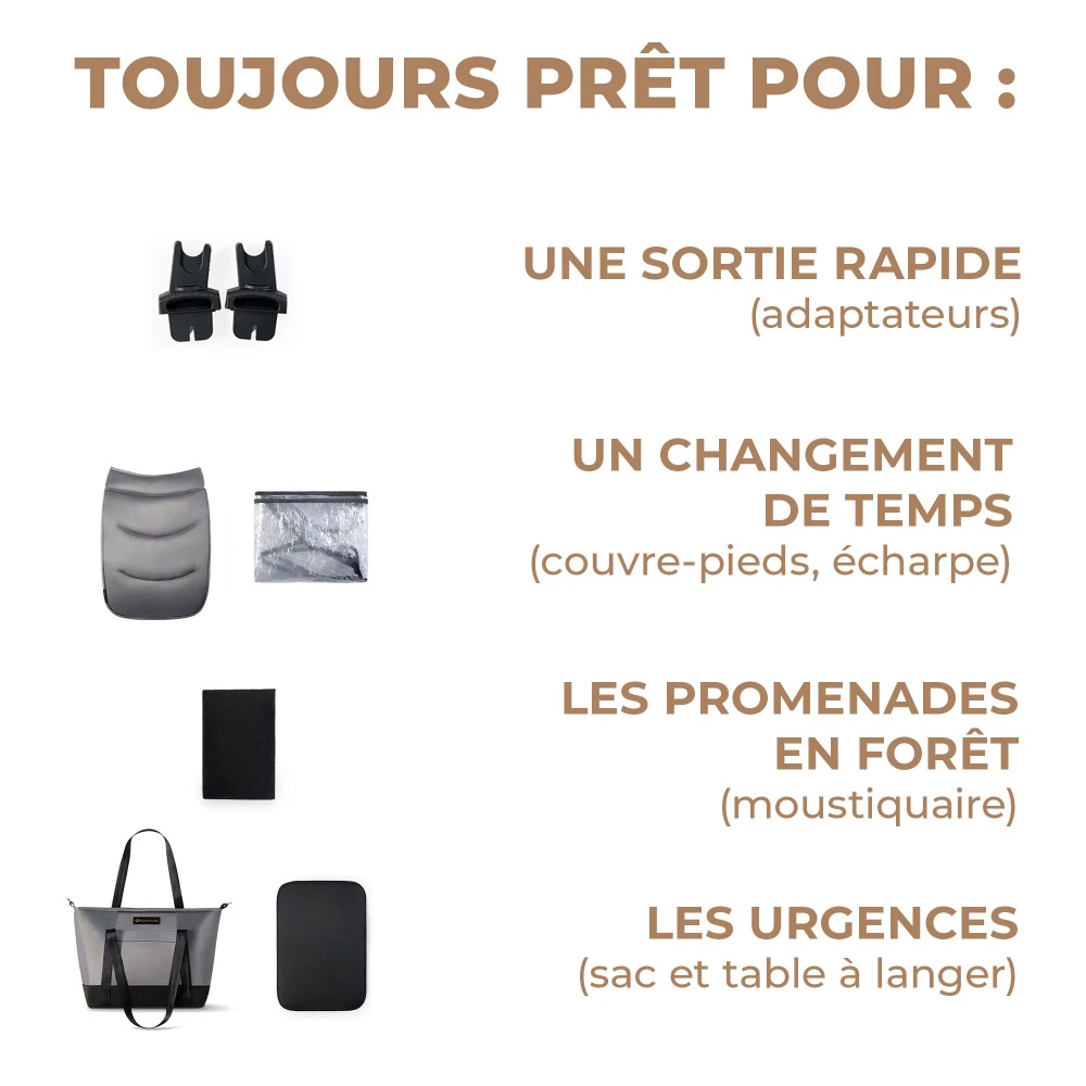 - Accessoires : un sac à langer, une housse de pluie, une moustiquaire, un protège-pieds (pour poussette et nacelle), des adaptateurs universels, un matelas de nacelle