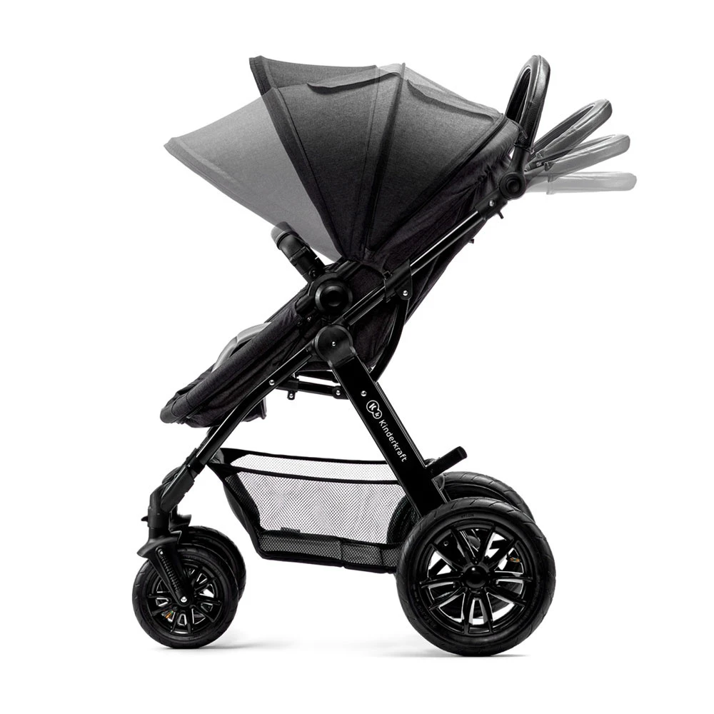 - Les grandes roues gonflables garantissent un amortissement parfait et, en plus, la poussette est facilement manœuvrable grâce à la possibilité de pivoter les roues avant jusqu’à 360 degrés avec verrouillage.