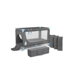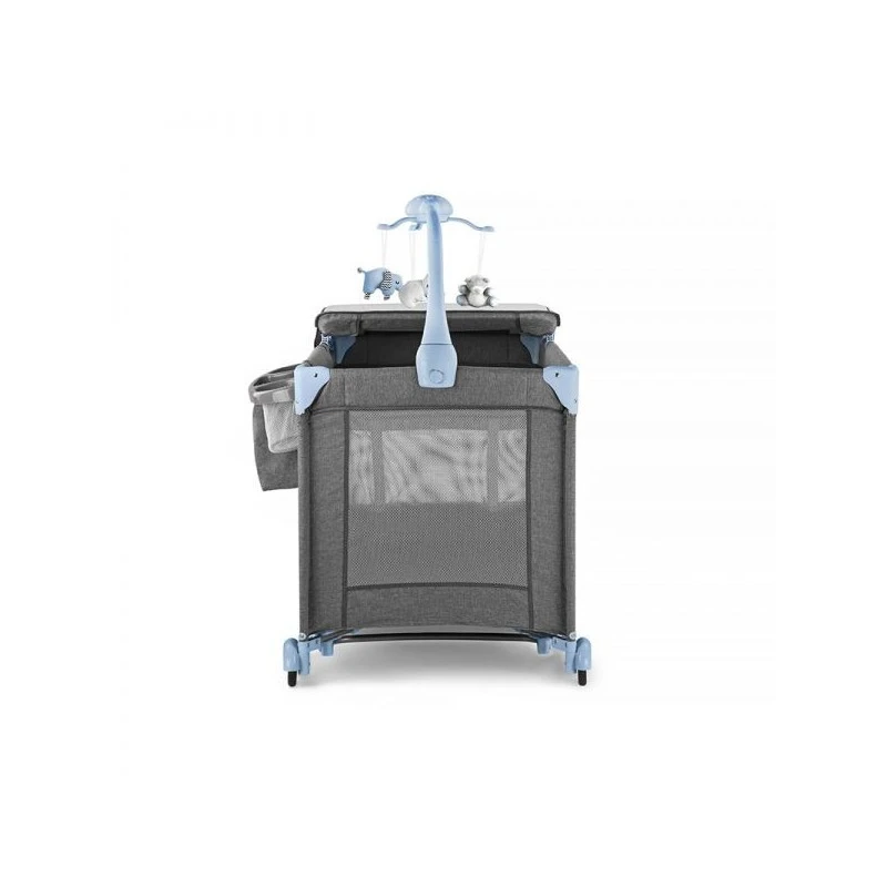 - Accessoires : plan à langer, rangement pour couches, carrousel son et lumière avec 3 jouets, matelas, sac de transport avec ouvertures pour les roues