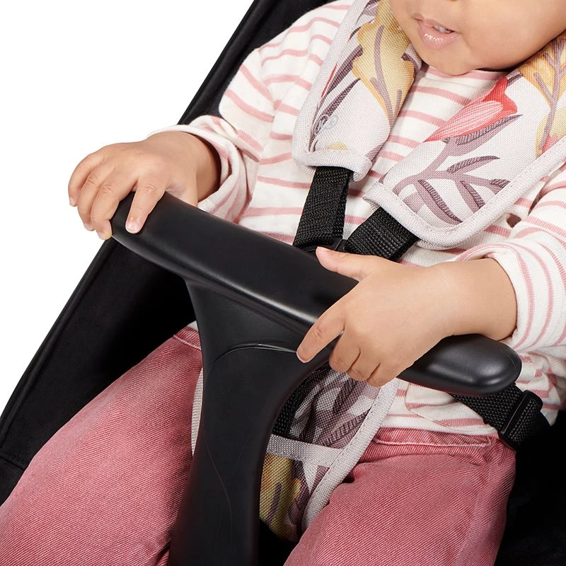 - Forme moderne de l’arceau de sécurité (lettre T). La poussette peut être pliée sans le détacher. Facilite la mise en place et le retrait de votre bébé