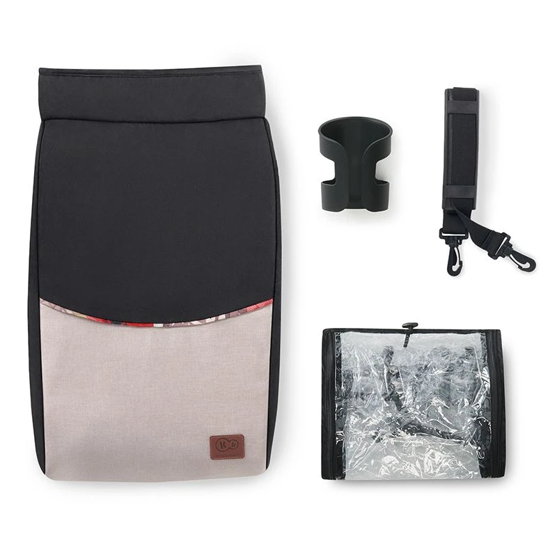 - Panier (charge maximale : 2 kg), chancelière, habillage pluie, porte-gobelet et sangle pour porter la poussette sur l’épaule inclus